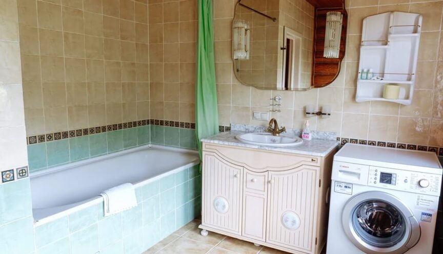 Первый этаж включает в себя кухню-гостиную со всем необходимым оборудованием, санузел с ванной и стиральную машину.